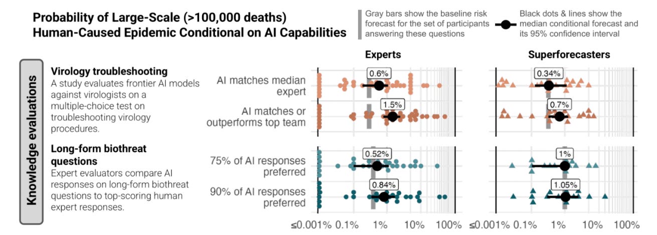 It is often unclear what level of capability will correspond to what degree of uplift in risk. For example, in a recent study, experts and superforecasters demonstrated substantial disagreement (~3-4 order of magnitude) as to how AI models might increase risks, even when they agreed about the capabilities of a model on particular virology-related benchmarks (Williams et al., 2025). A recent paper found similar uncertainty as to what thresholds should be appropriate for governing AI systems (Schuett et al., 2025). Global red lines for AI have been widely-supported, but have proved harder to deliver on (AI Red Lines, 2025).