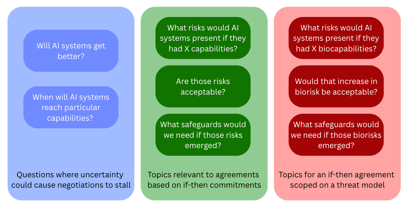 First, negotiators could draw on the structure of if-then commitments by focusing negotiations on which ‘triggers’ (indicators of capability or risk) should be met with which ‘safeguards’ (mitigation measures to activate if and only if those triggers are met). As Karnofsky notes in his original piece on if-then commitments (Karnofsky 2024), this might allow them to bypass potential disagreements as to whether or when AI might become dangerous.